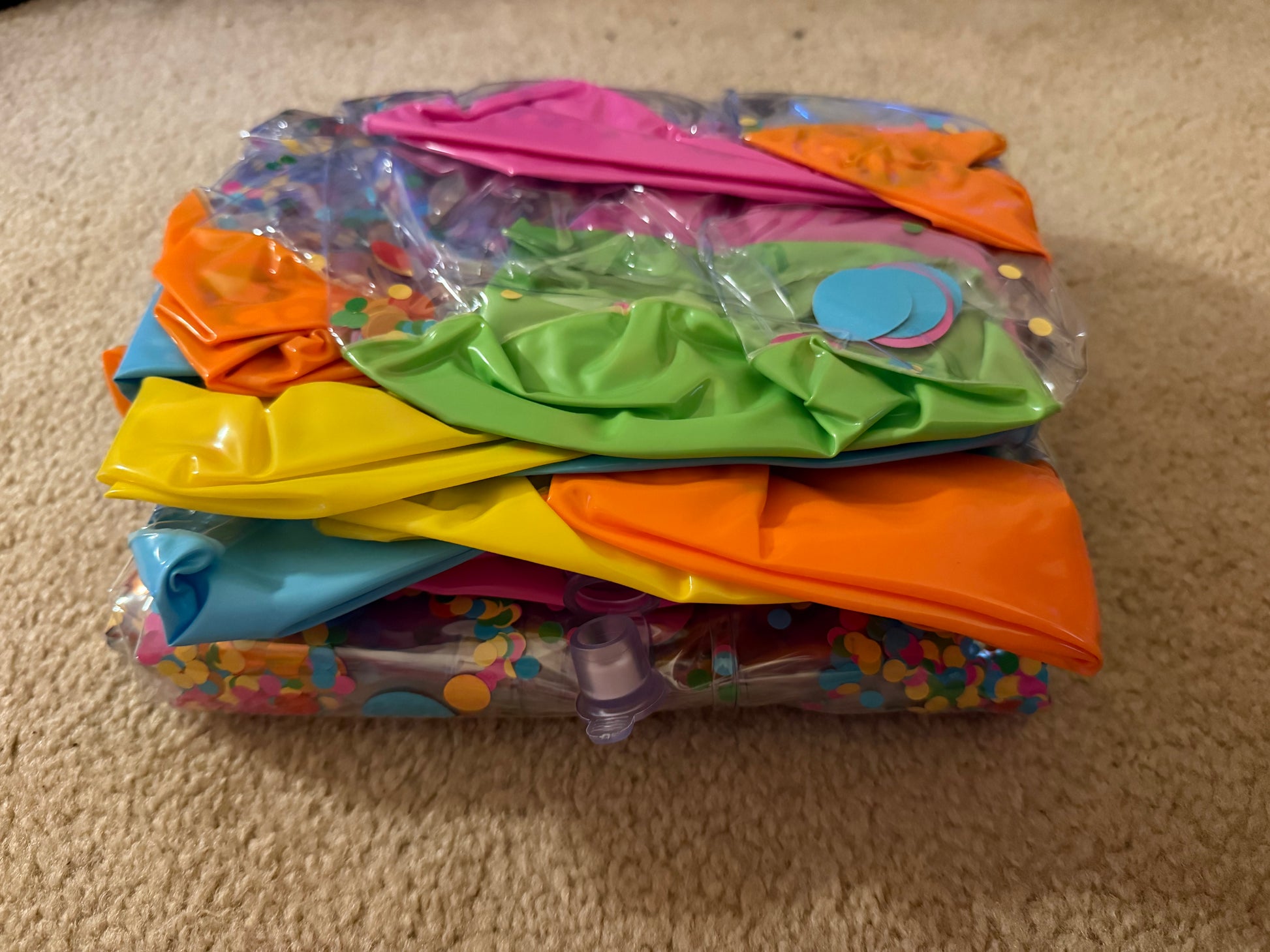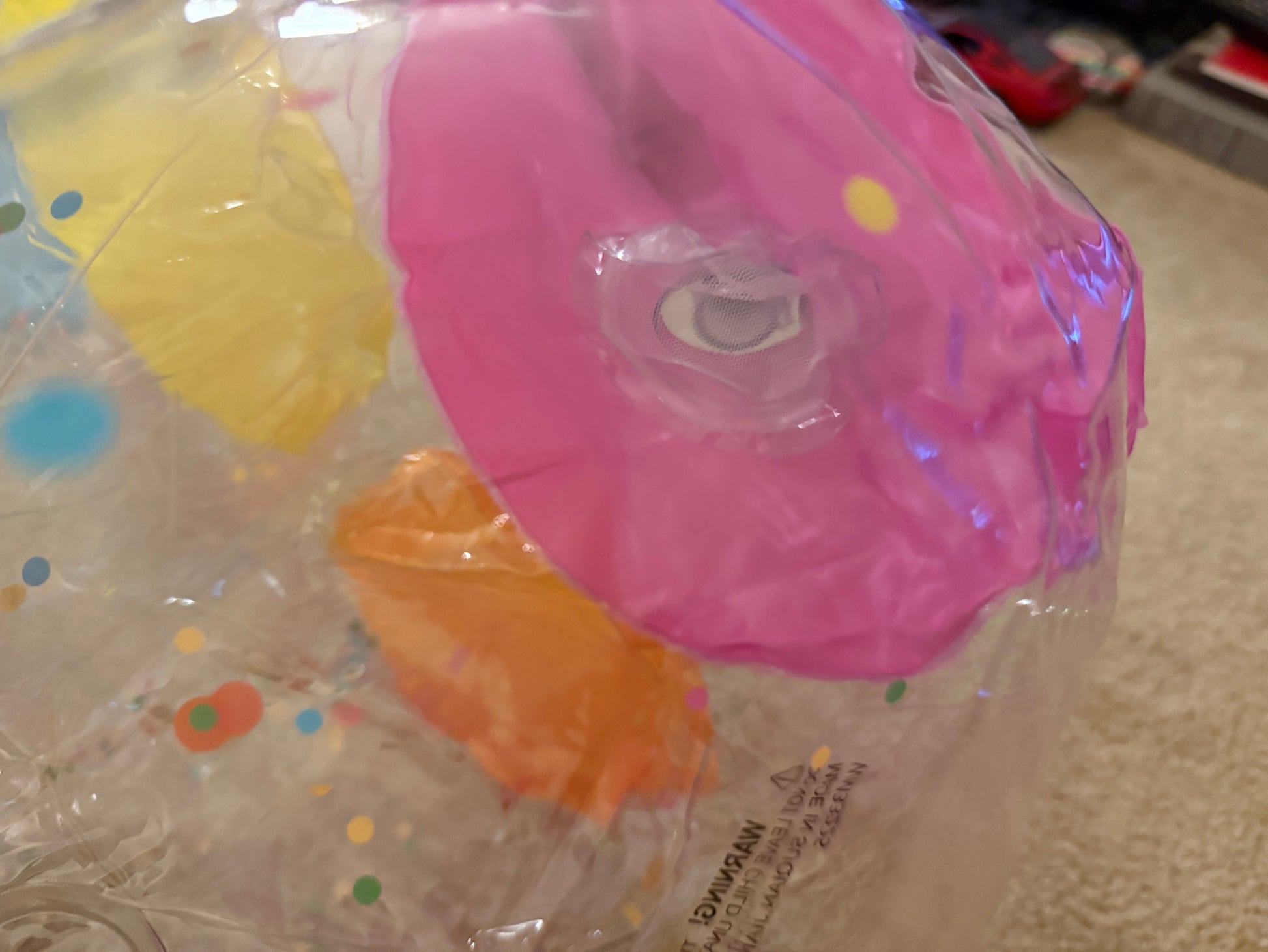 Soft material in clear with confetti and unique new inflation screen on a custom-esq toy valve. Luxury style like sunnylife’s version except smaller.