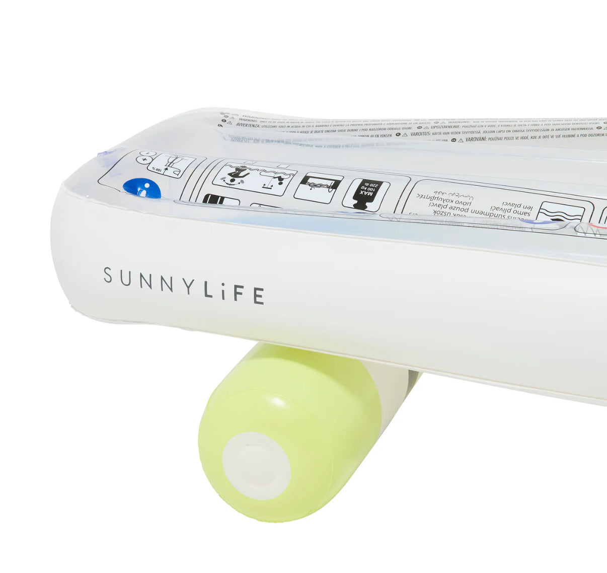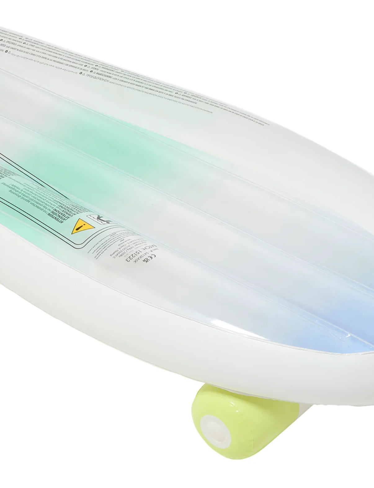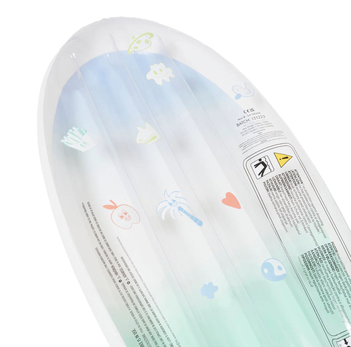 Just over 59 inches long and made by luxury floats brand sunnylife. Includes a set of skater-esq stickers. Made with relatively soft material. Transparent front and back, solid on sides.