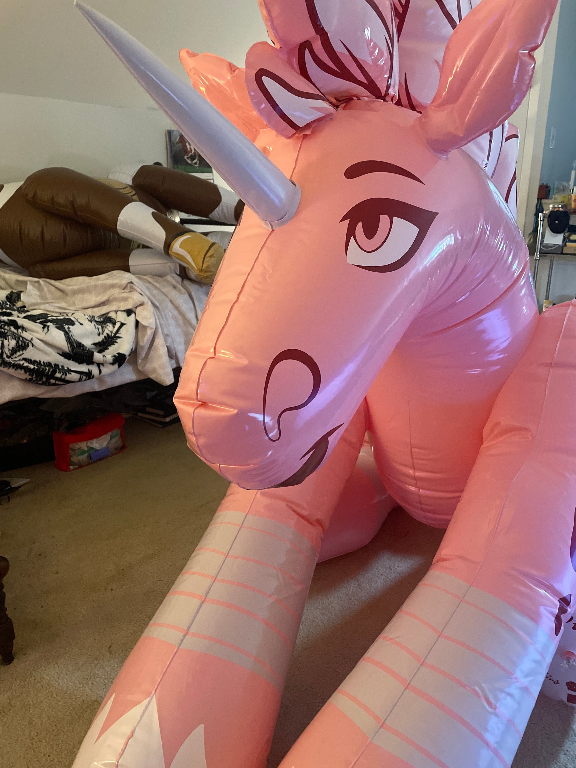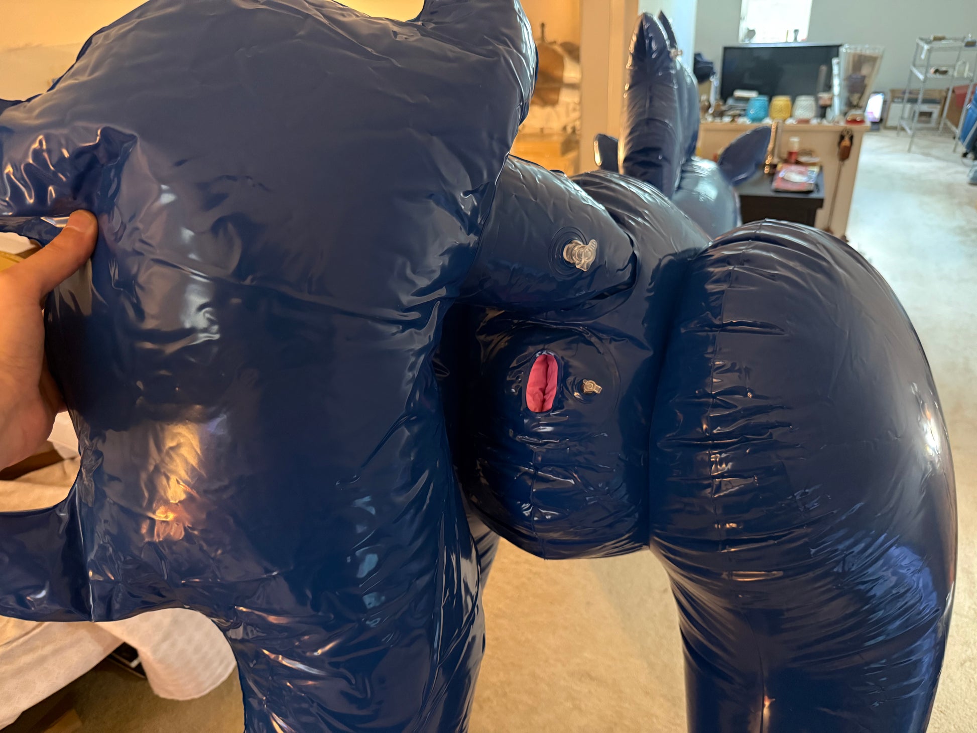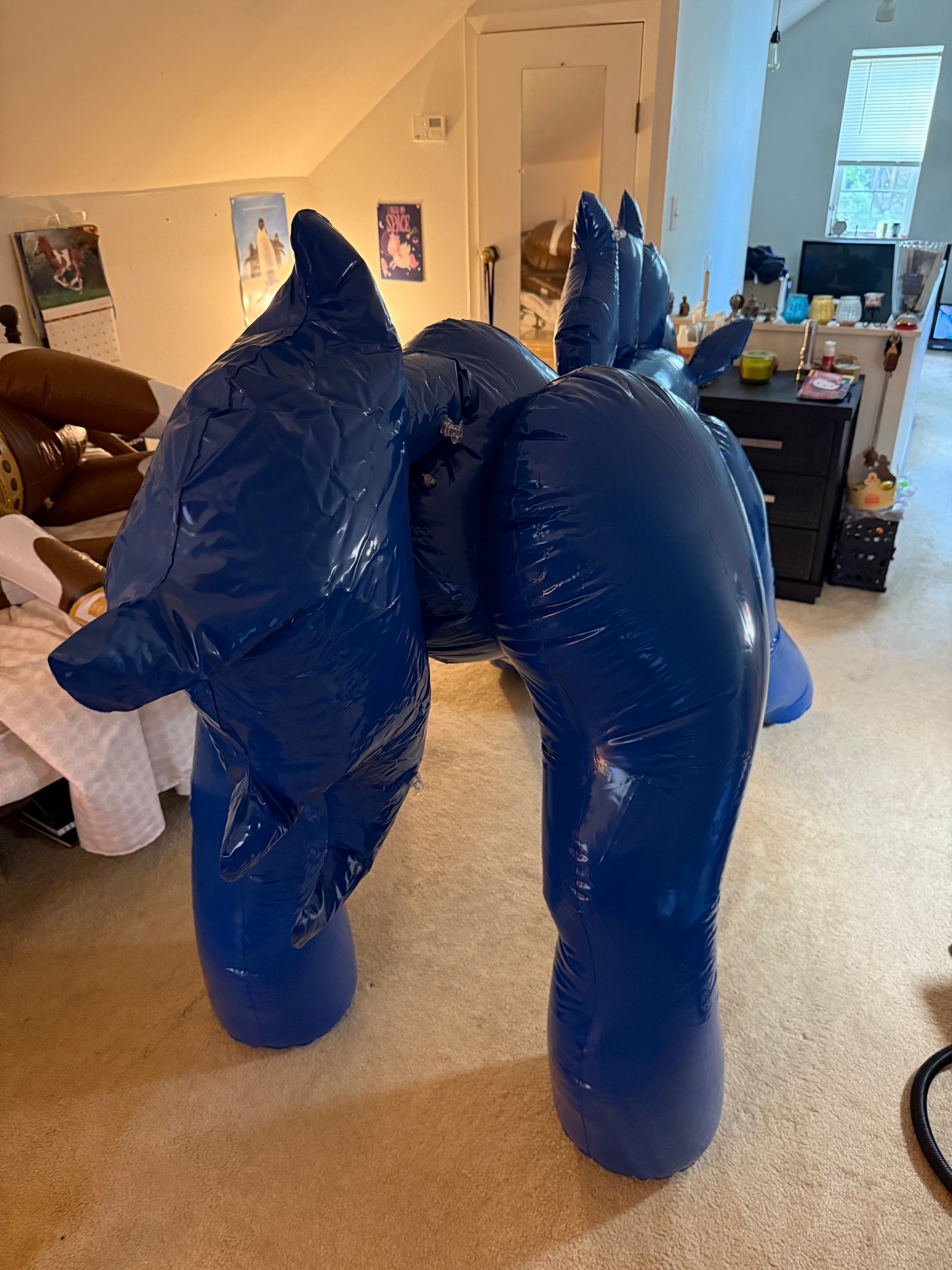 Bad ass gothic inflatable unicorn “Das Einhorn” in secret blue. Material is custom soft shiny. There have been improvements made to the horn and internal sph material. It provides a light gentile feeling while also remaining tight. The blue/exterior material is slightly thicker and provides the feeling of a special custom one off toy experience.